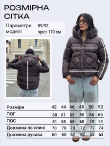 Заміри поверх курточки (від шва до шва) Пуховик молодіжний для дівчат і жінок, які полюбляють ексклюзивний гардероб. Фасон зимової куртки неймовірно зручний, особливо для автоледі. Оверсайз додає сучасного вигляду формі вільного крою. Рукава із м’якими манжетками, що ховаються під основною вітрозахисною тканиною і утримують зап’ясток в теплі і комфорті. Глибокі кишені, зручний капюшон роблять цю модель дуже універсальною та практичною. Водовідштовхувальна тканина, яка не залишає плям та якісний наповнювач захистить від вітру та снігу до -20, низ пуховика регулюється кулісою.